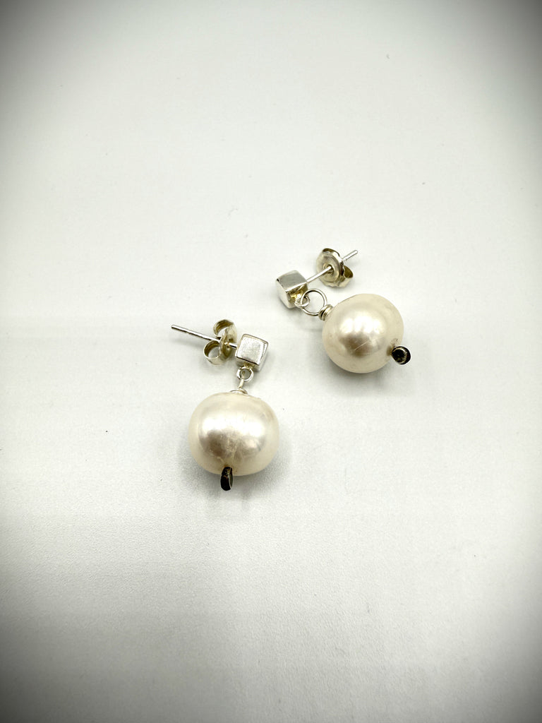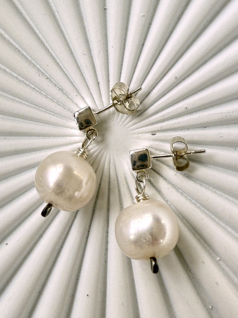 square post earrings with a creamy white juicy freshwater pearl, 1/2" long...a true classic and favorite