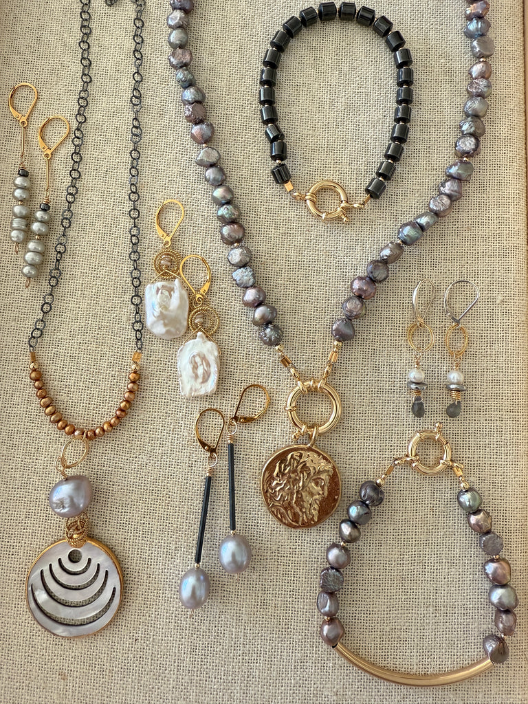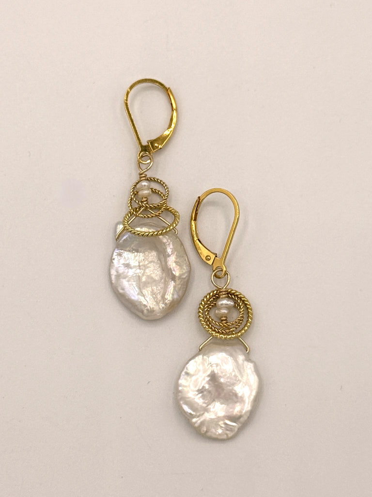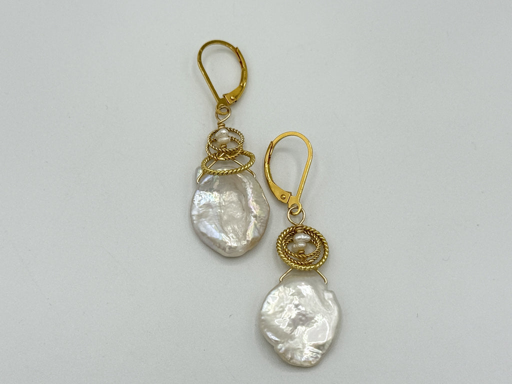 • Keshi pearls topped with 14k gold filled twisted rings and tiny pearls with 14k gold filled French clip ear wires, these are light weight and hang approximately 1" long