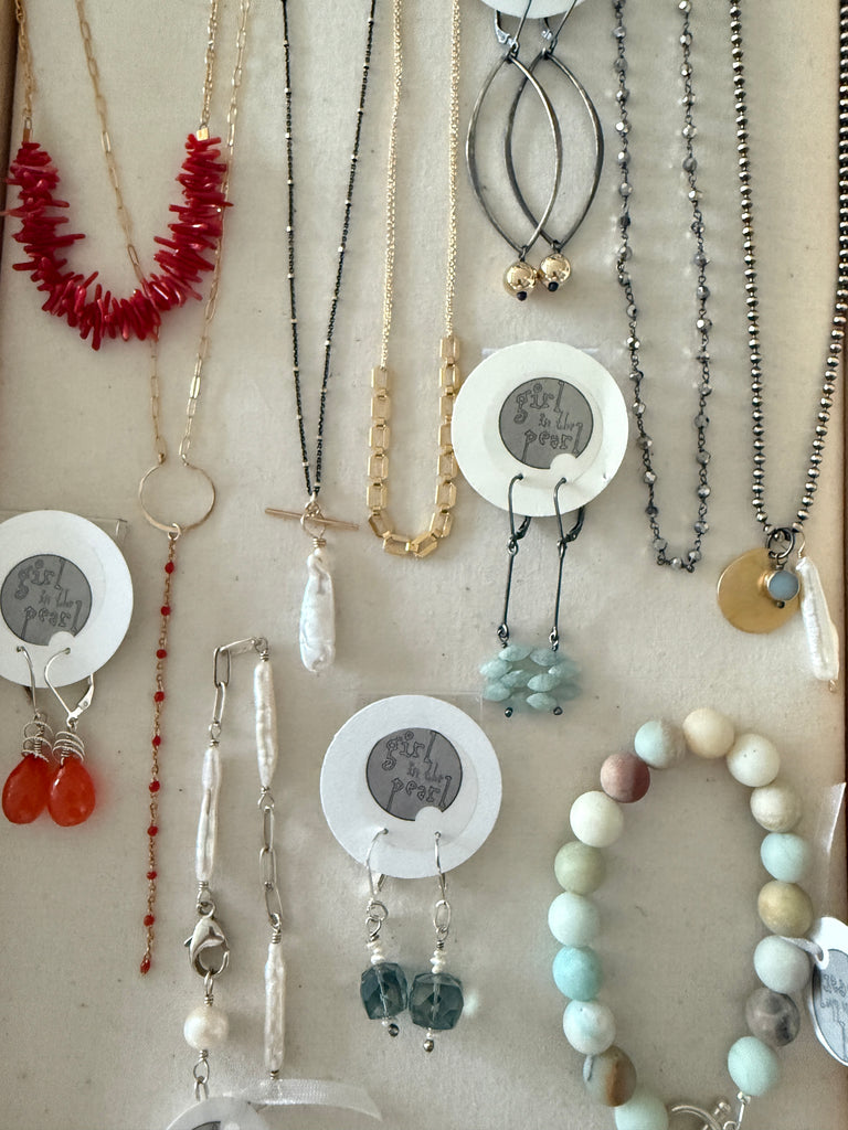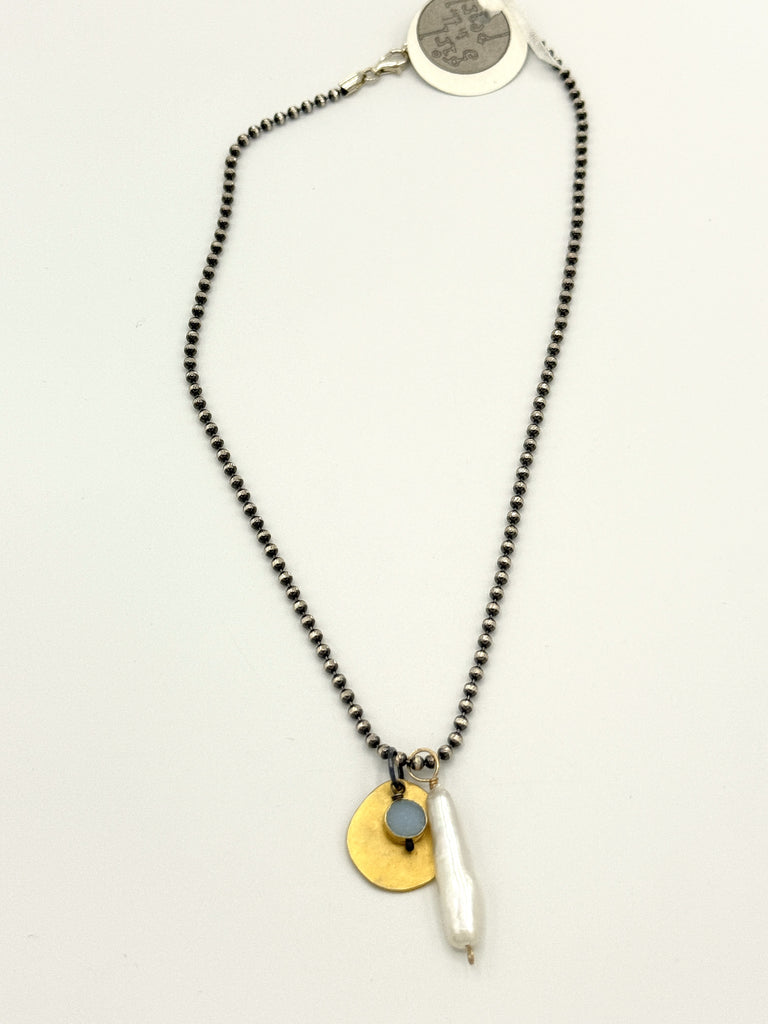 oxidized sterling silver chain with a modern cluster: fresh water stick pearl, druzy quartz and gold plated organic shaped disc, approximately 16" long with a trigger clasp closure