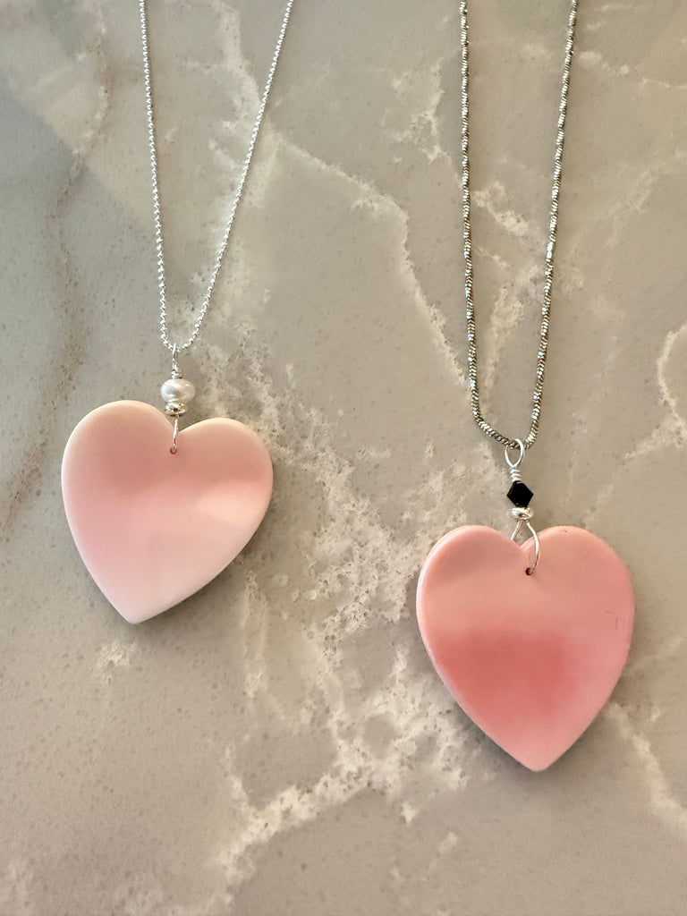 pink Conch shell hearts in a delicate pink topped with freshwater pearl or black crystal, shiny sterling silver cut ball chain and pearl is 24" long and can be adjusted to any shorter length, the black crystal and heart is 30" long stainless steel chain, great for layering and showing your love!