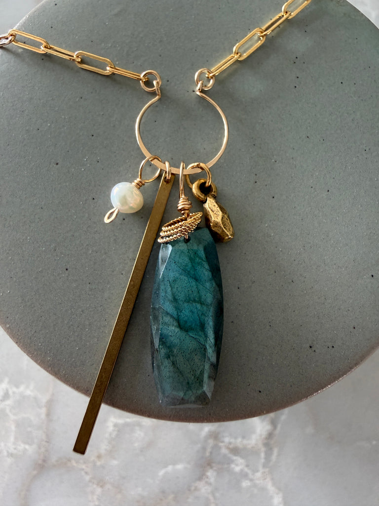 a charm like necklace with a labradorite pendant and freshwater pearl, 14k gold filled link chain hangs 22" long with additional 1" of adjustment, trigger clasp closure...this is a one-of-a-kind piece