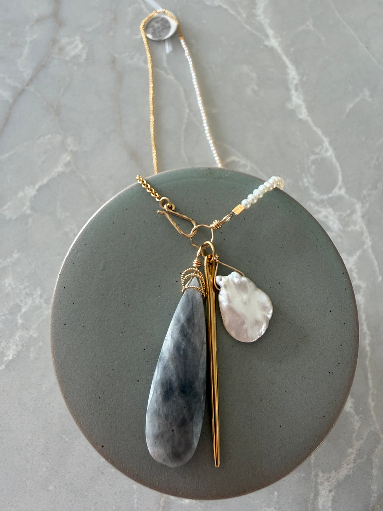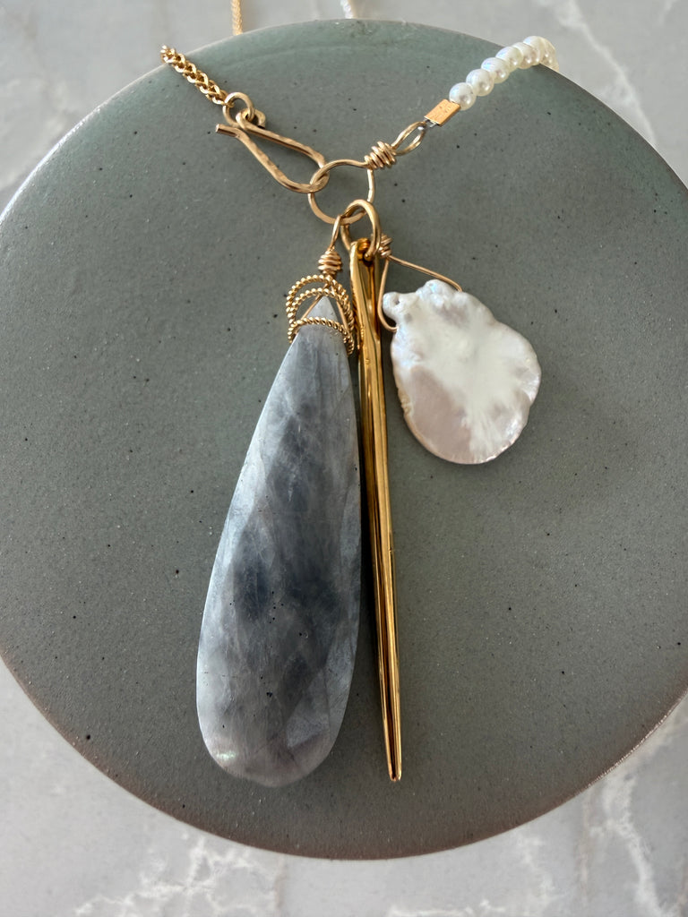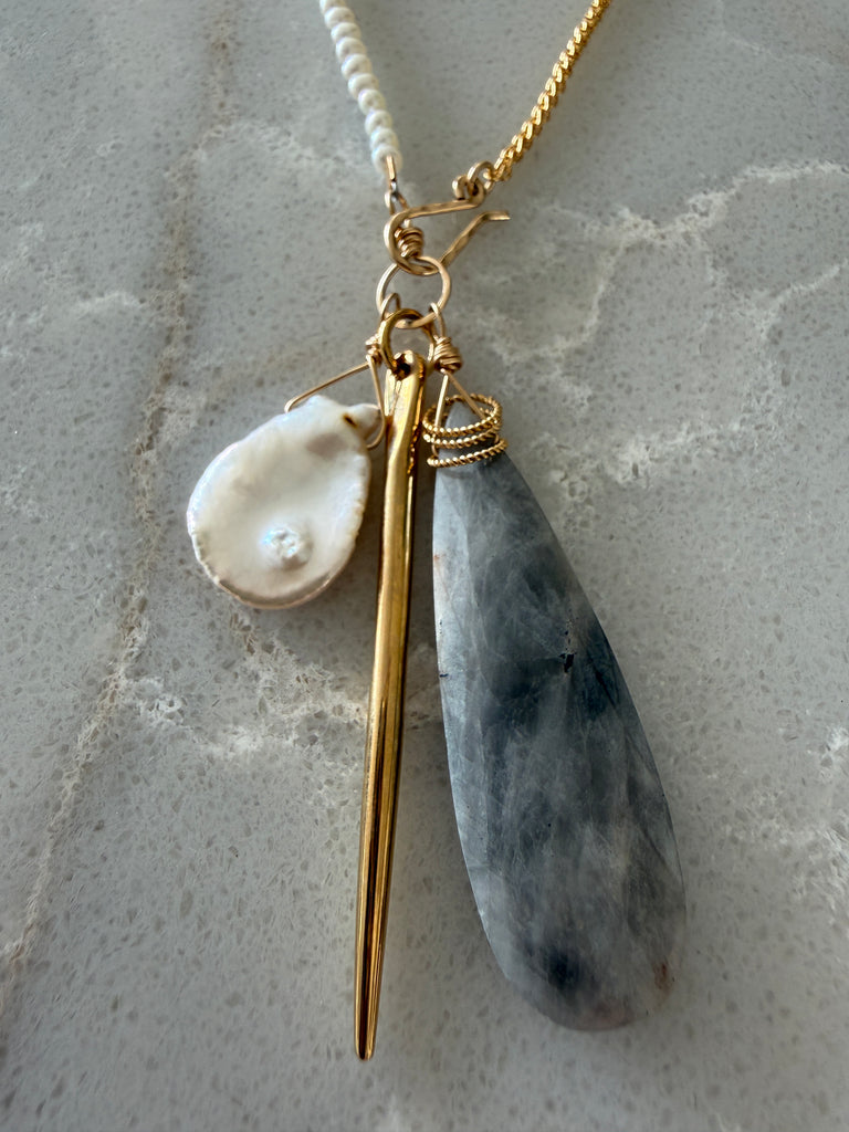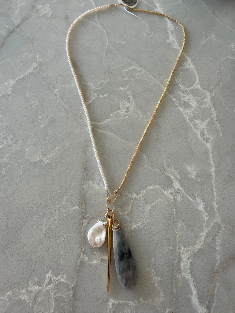 • this necklace is half creamy white seed pearls and half 14k gold filled French rope chain, it has a hook and eye closure with a trio of drops, silverite, keshi pearl and a gold dagger making this piece very unique with a good balance of edge and sophistication, it hangs 26" long