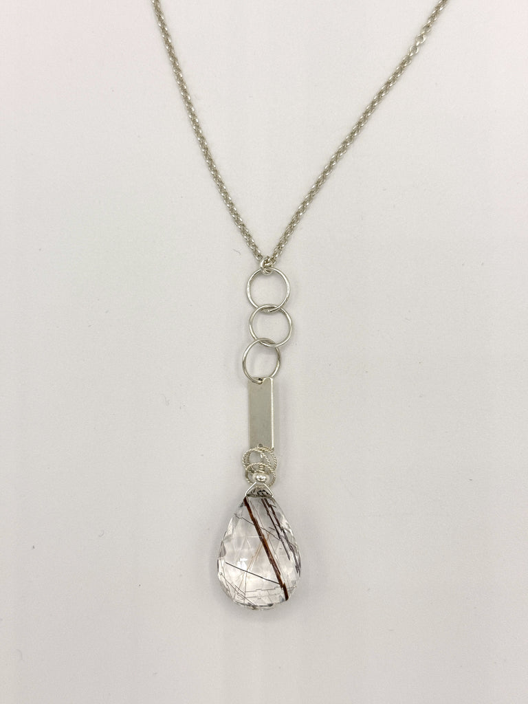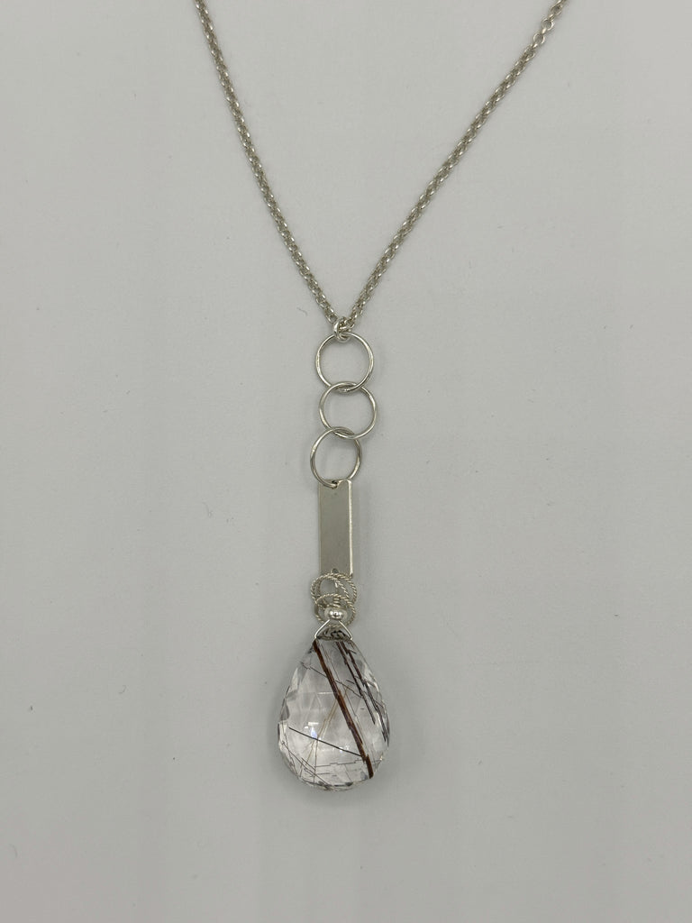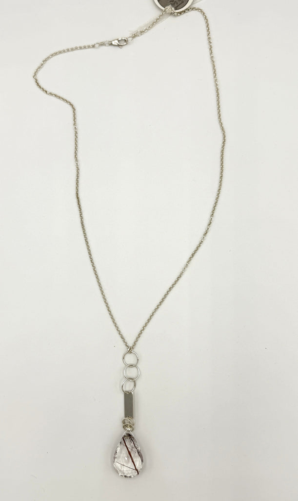 this fat juicy quartz has a reddish rutilation and gorgeous light catching facets, it's paired with sterling silver and topped with twists of silver, the necklace measures 20" long and the pendant with silver and links is an additional 3", totaling 23" over all length