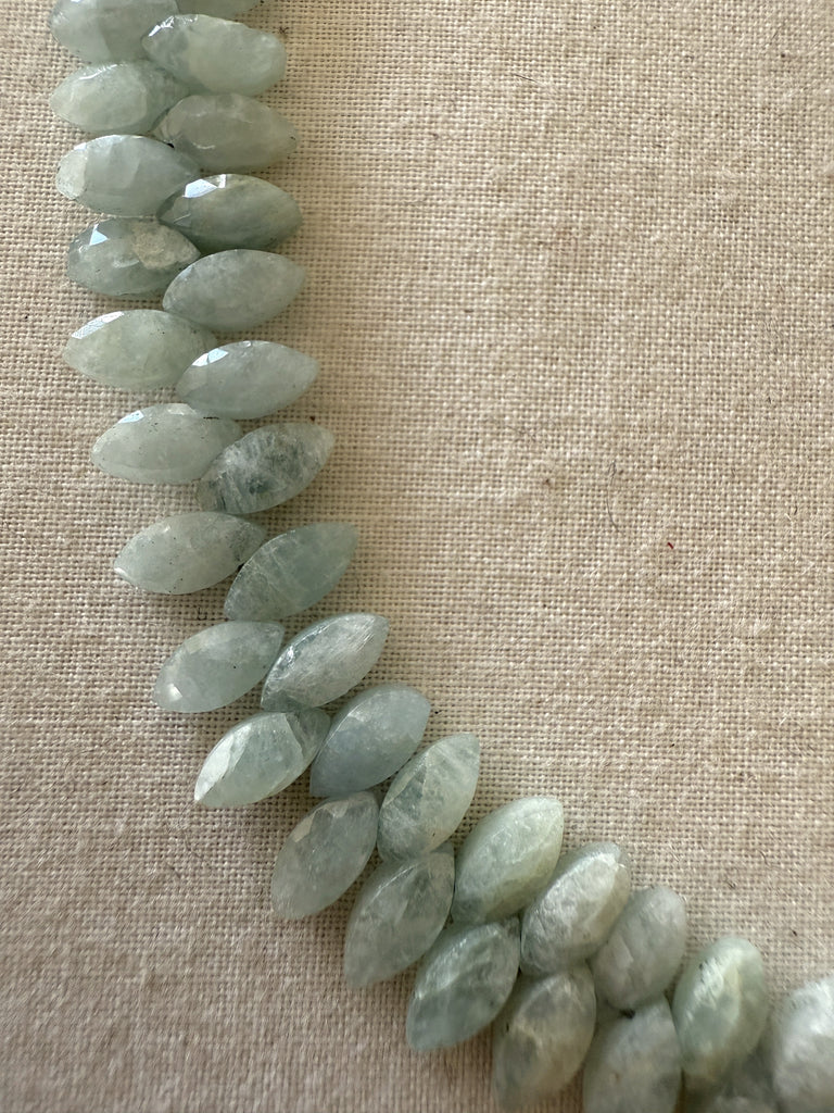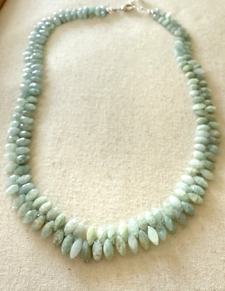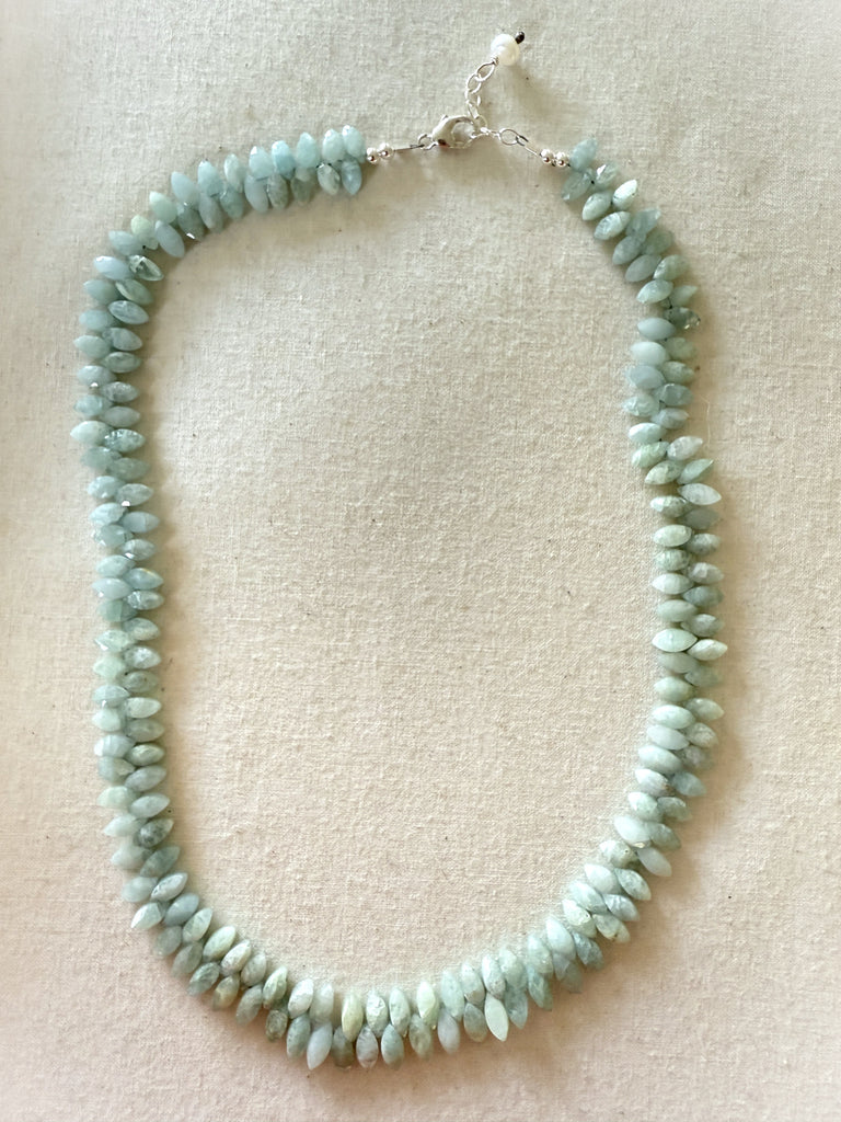 • This beautiful necklace is composed aquamarine in gorgeous blue-green hues of tiny leaf shapes alternated to give it movement and interest, sterling silver clasp and additional 1" extender with fresh water pearl, this necklace measures 16-1/2" long
