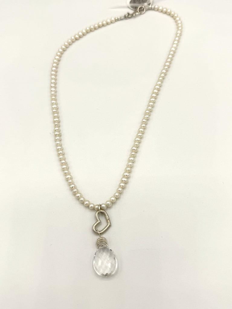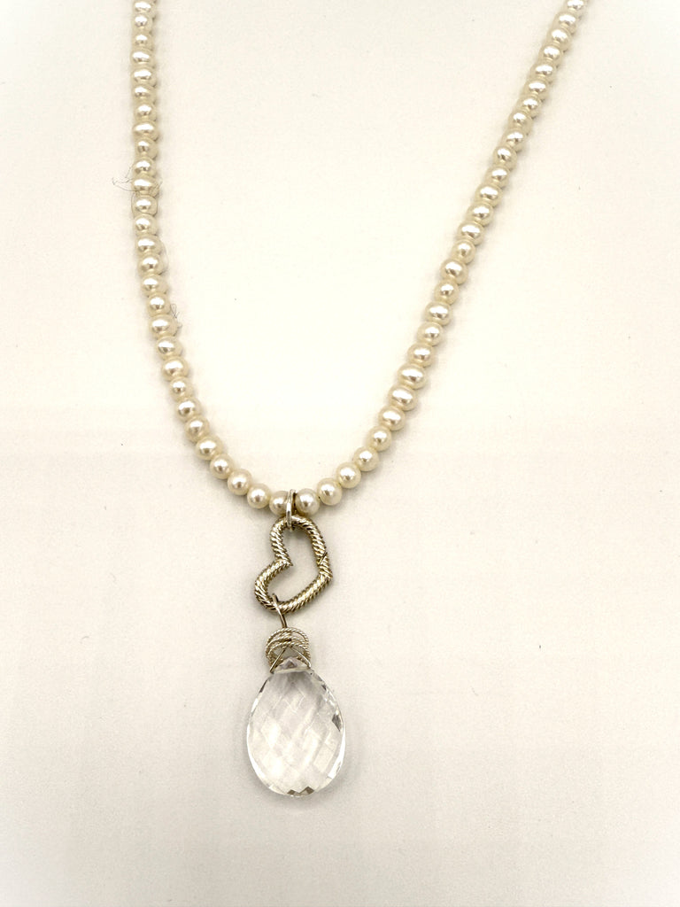 freshwater pearl necklace with sterling silver heart and tear drop rock crystal topped with sterling silver rings, approximately 19" long, the heart is a clasp which can be removed along with the crystal pendant...it's nice to have options