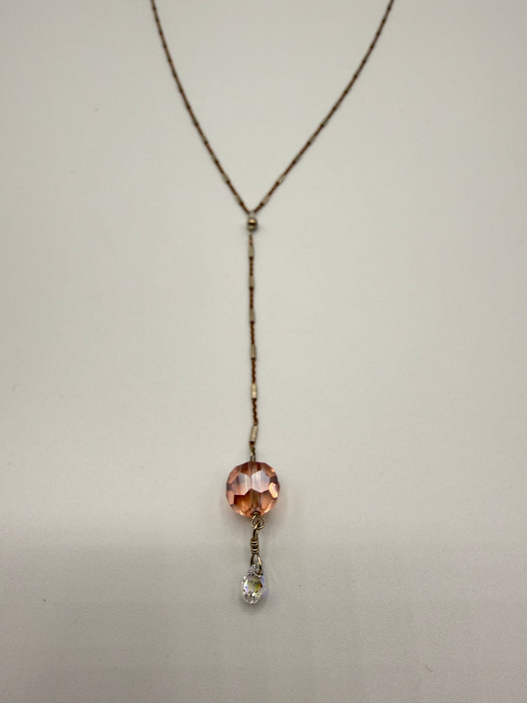 rose gold/sterling silver "Y" necklace with pink crystal and dangling clear crystal, sterling silver trigger clasp closure, approx. 28" long, one-of-a-kind