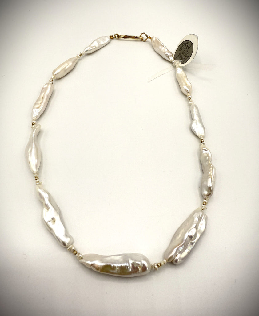• 1-1/2" freshwater stick pearls are huge with a beautiful brilliance, rice pearls and 14k gold separate each unique pearl, 14k gold filled link clasp, approximately 17-1/2" long