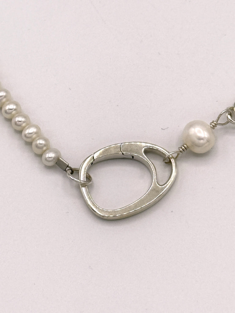 • sterling silver clasp in the front is a modern take on a pearl necklace with some asymmetry to keep it fun and your eye moving, the large clasp can be used to hang a pendant of your choice or worn as shown, necklace measures 17-1/2" long